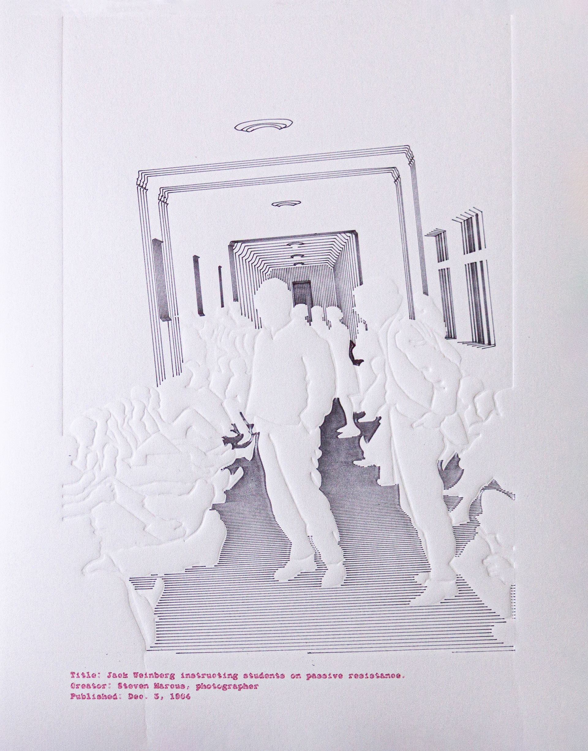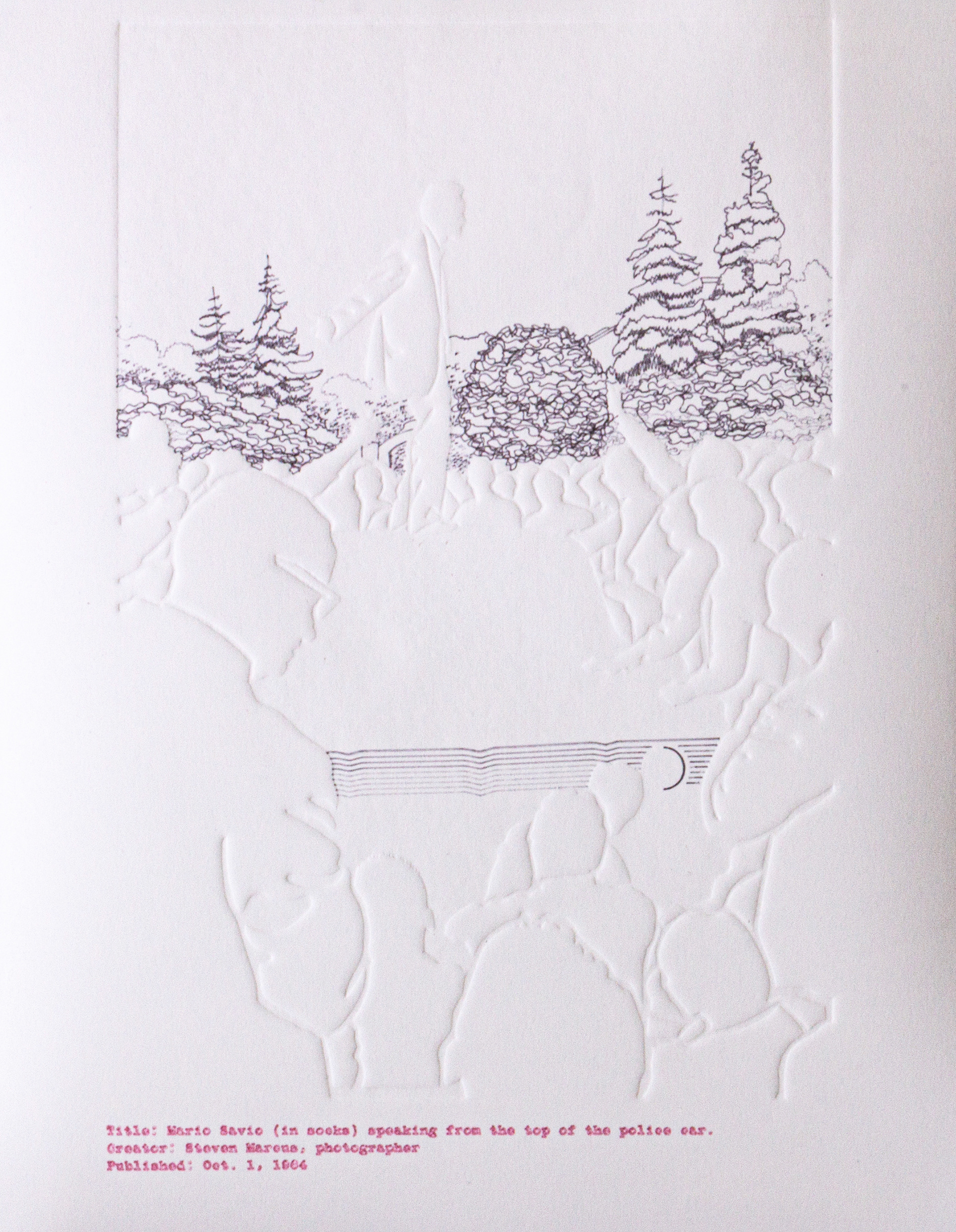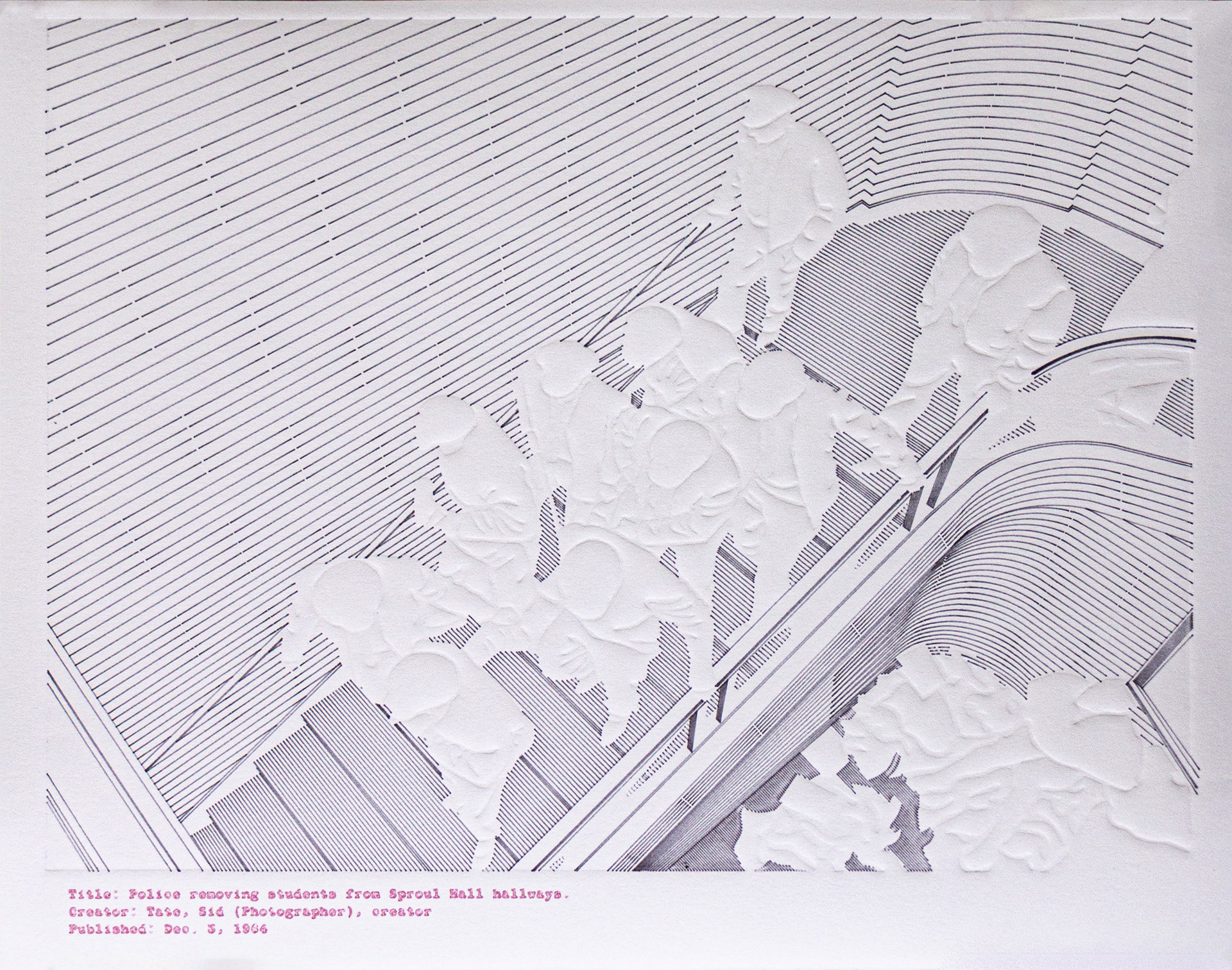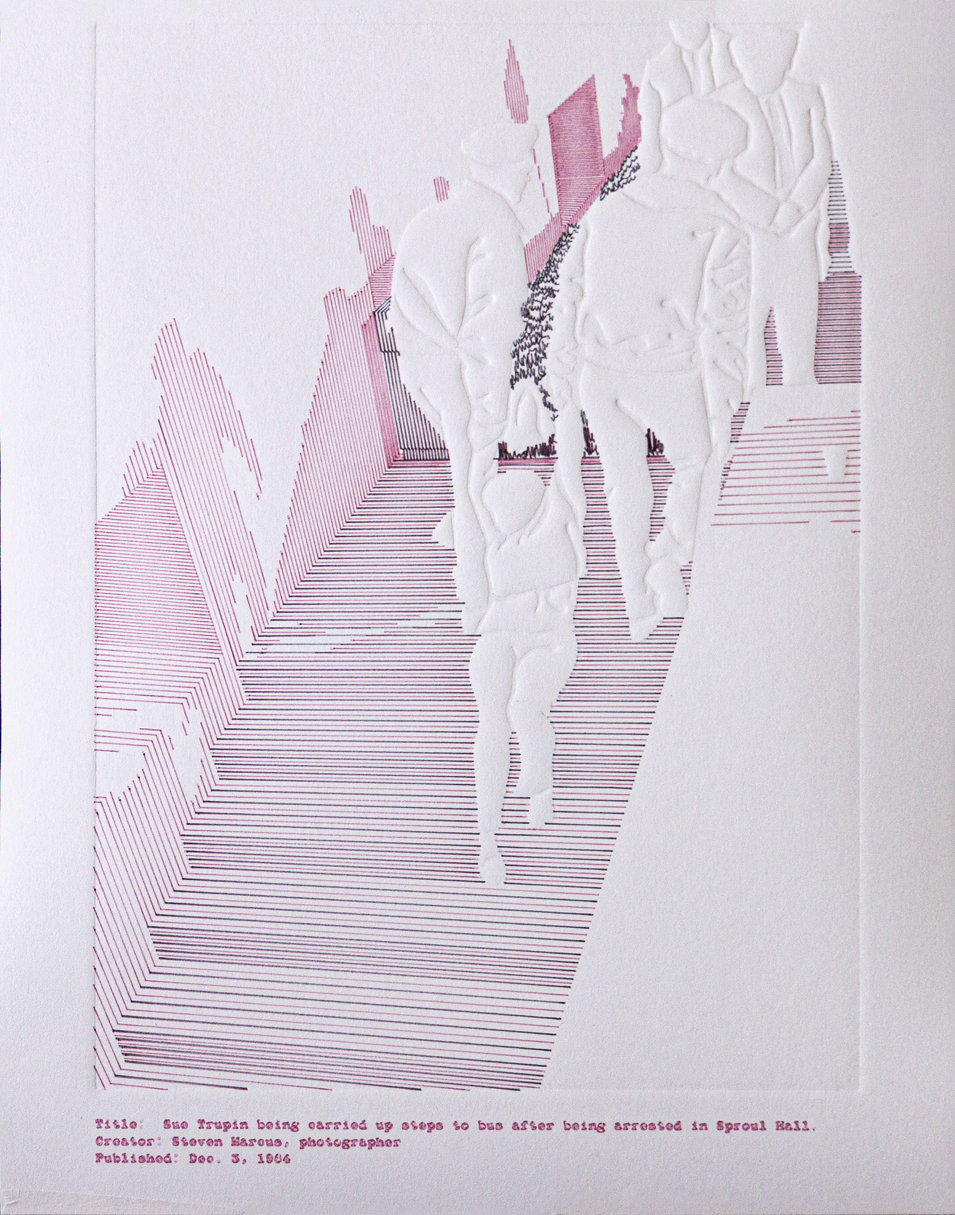 ‘b. Call in sick.’ takes its title from a type of participation listed in the document, ‘Instructions for Walk-out Coordinators,’ issued in 1964 during the Free Speech Movement (FSM) at UC Berkeley, to rethink how movements may move with exhausted and non-normative bodies. Here, I redact and abstract the FSM’s photographic archive in embossed drawings to question the archive’s function as witness and its capacity to hold disabled narratives should all the bodies documented in it have called in sick or been unable to access the site.