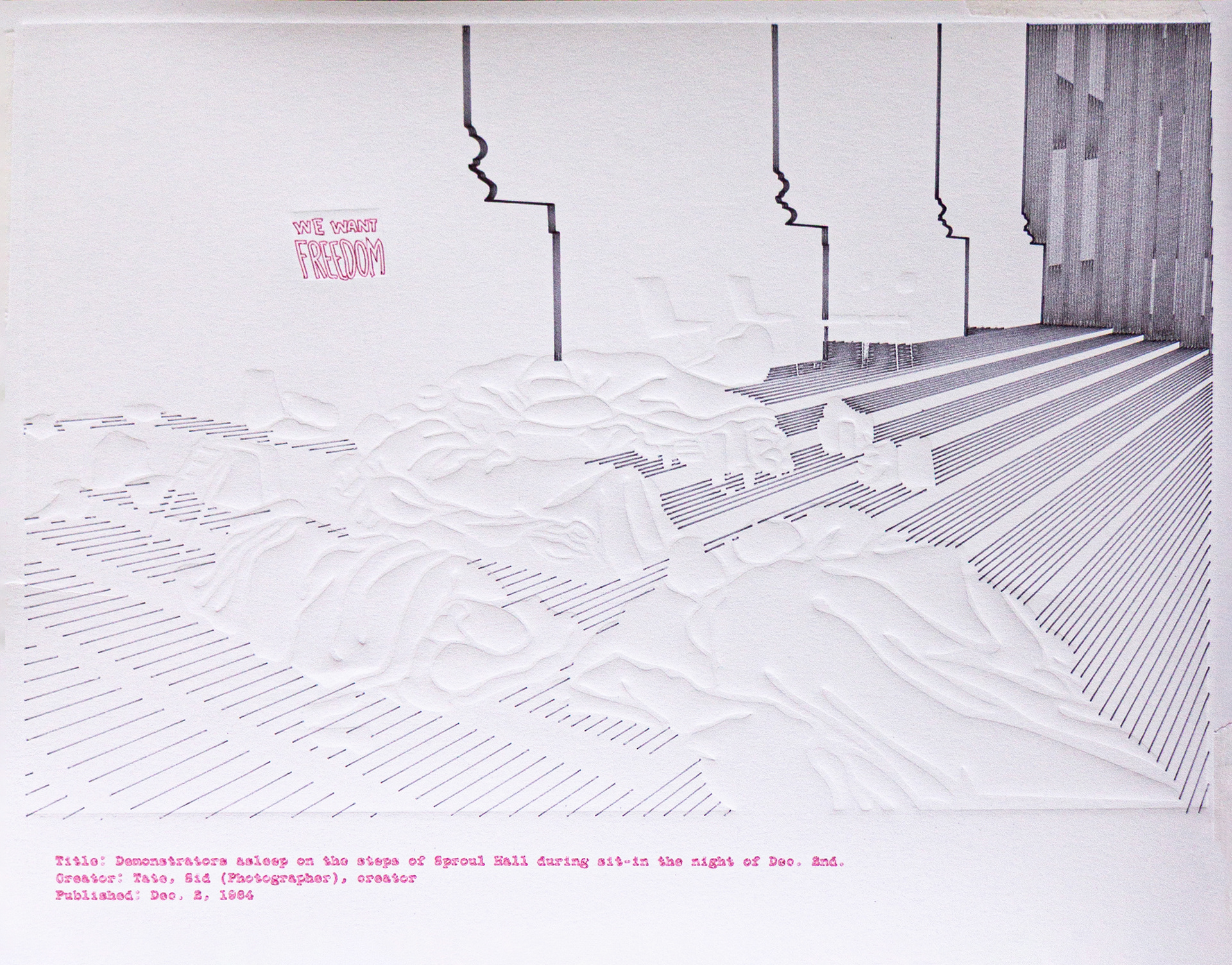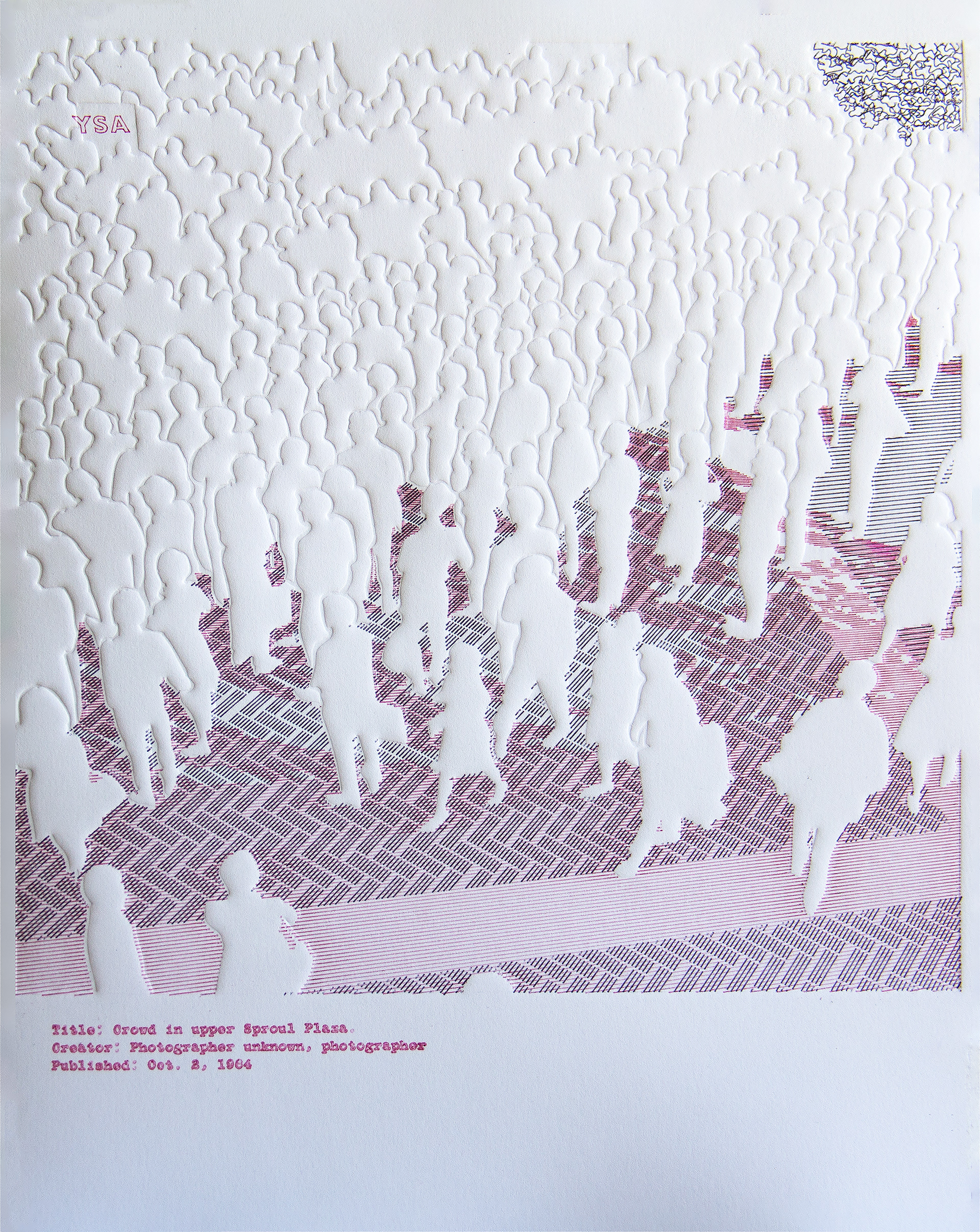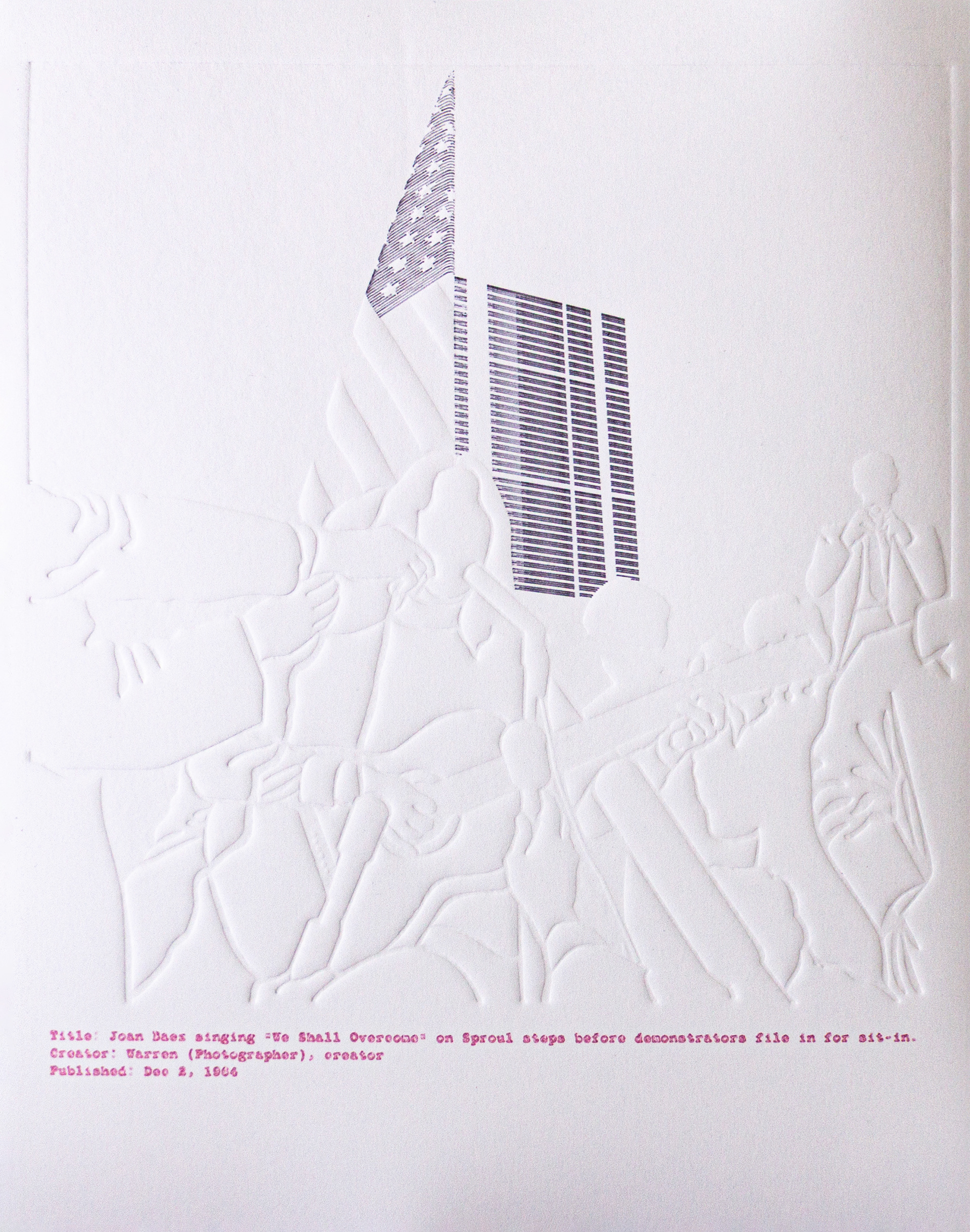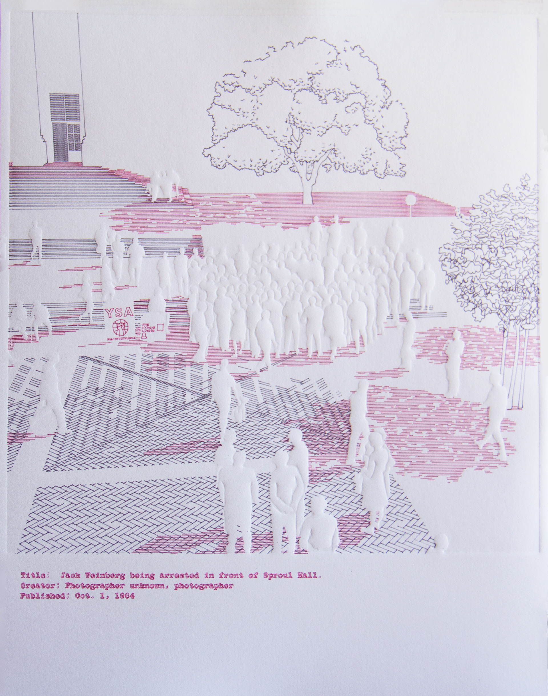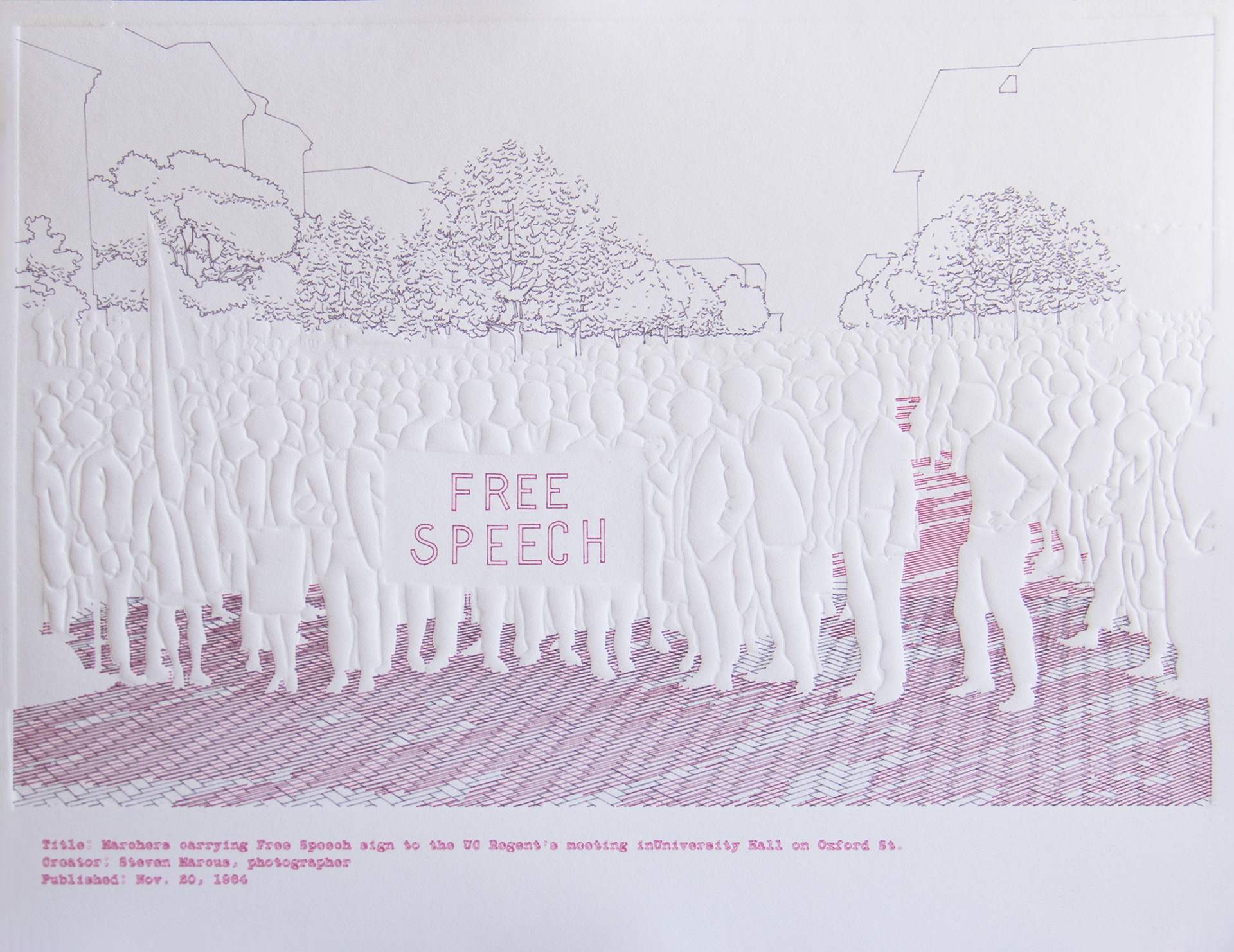‘b. Call in sick.’ takes its title from a type of participation listed in the document, ‘Instructions for Walk-out Coordinators,’ issued in 1964 during the Free Speech Movement (FSM) at UC Berkeley, to rethink how movements may move with exhausted and non-normative bodies. Here, I redact and abstract the FSM’s photographic archive in embossed drawings to question the archive’s function as witness and its capacity to hold disabled narratives should all the bodies documented in it have called in sick or been unable to access the site.