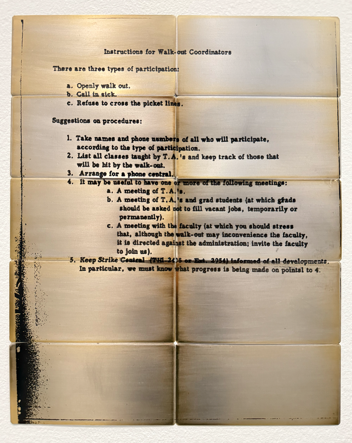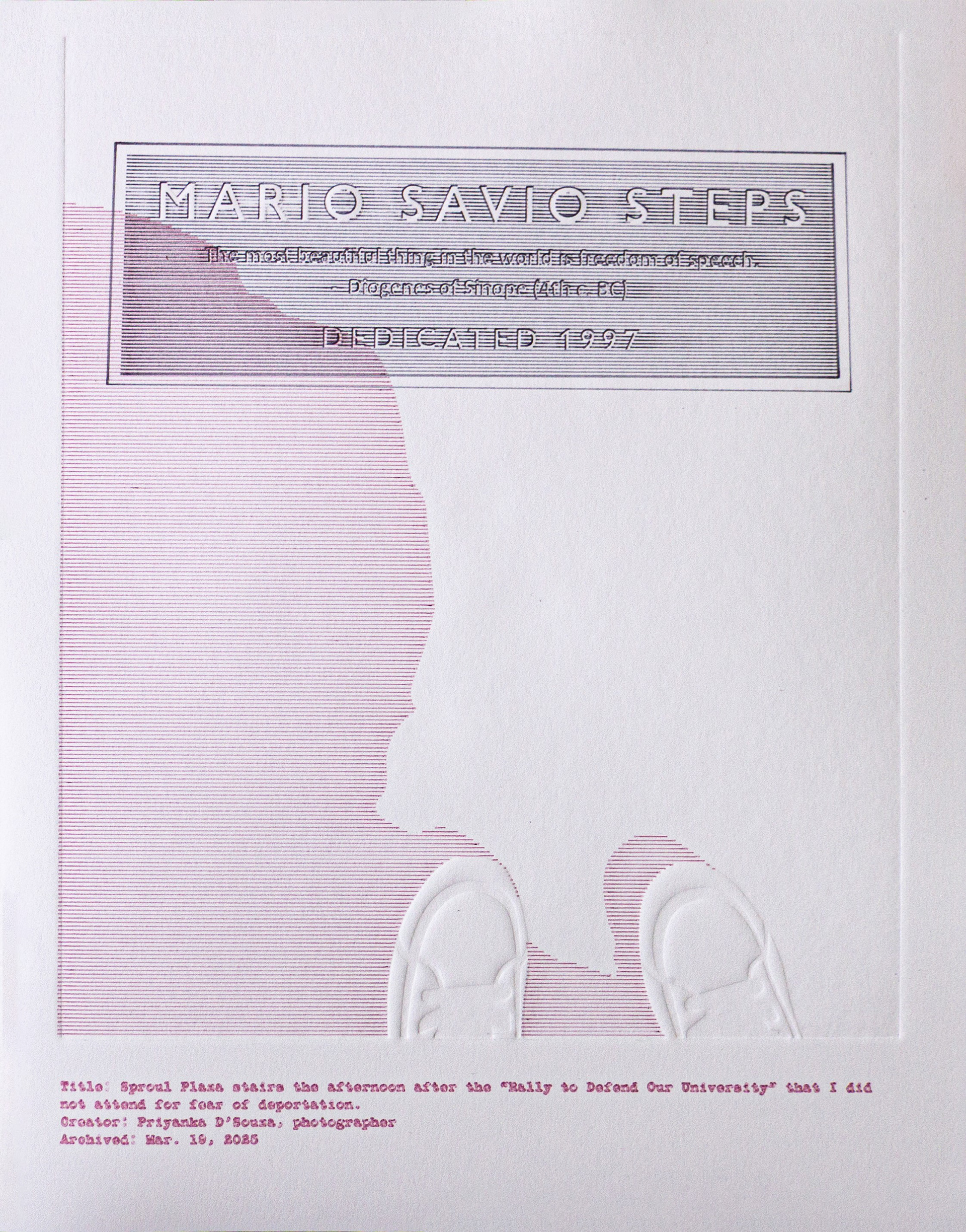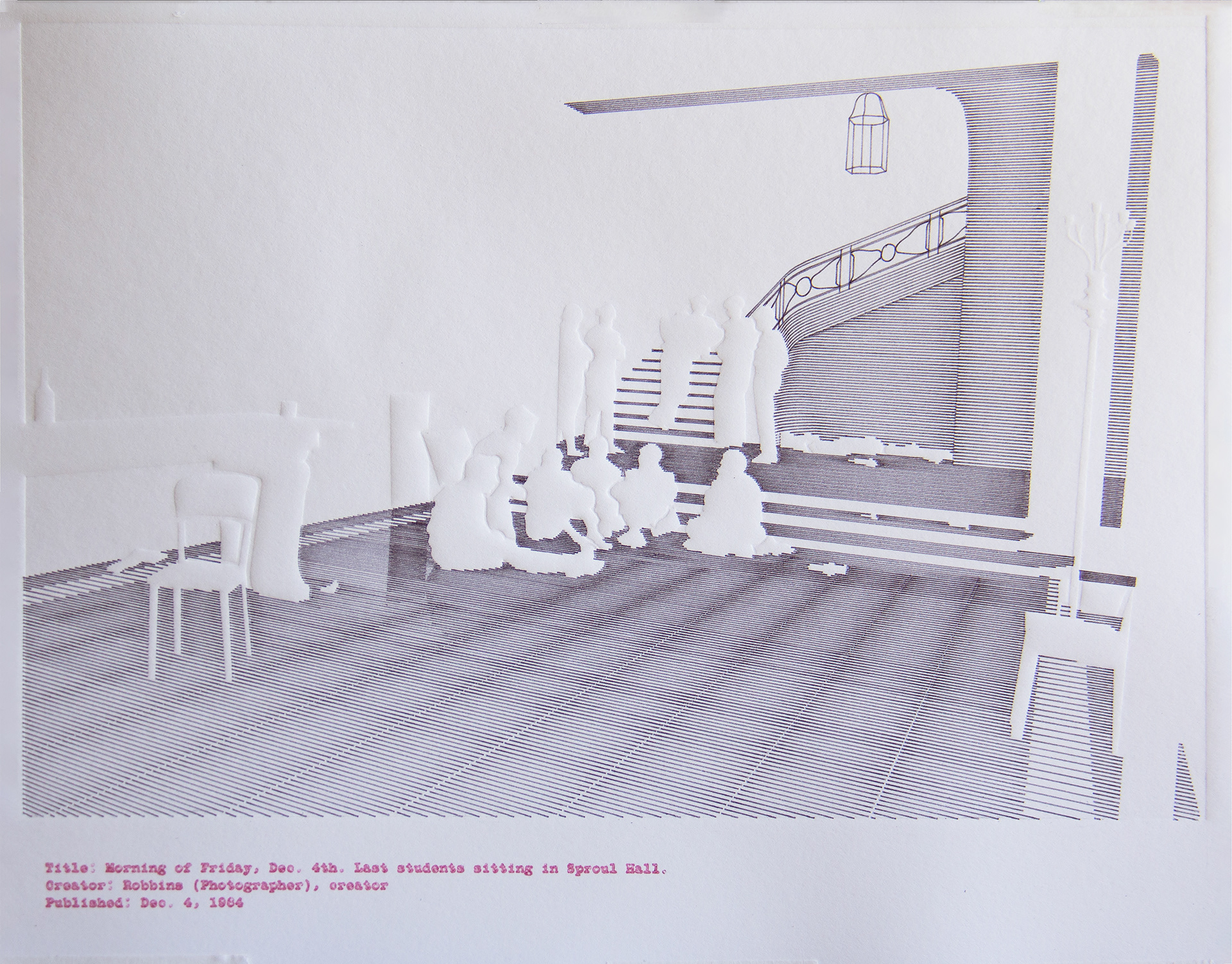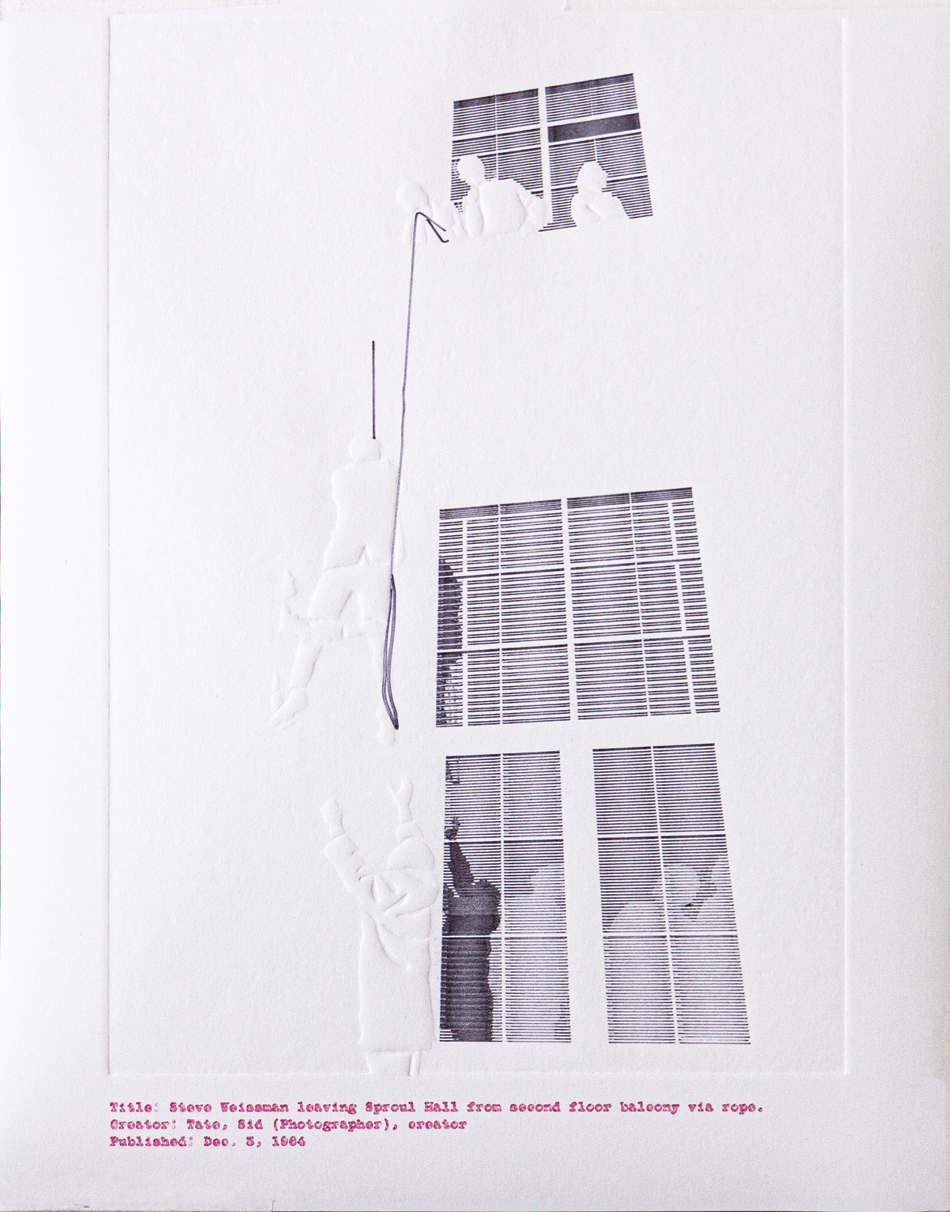 ‘b. Call in sick.’ takes its title from a type of participation listed in the document, ‘Instructions for Walk-out Coordinators,’ issued in 1964 during the Free Speech Movement (FSM) at UC Berkeley, to rethink how movements may move with exhausted and non-normative bodies. Here, I redact and abstract the FSM’s photographic archive in embossed drawings to question the archive’s function as witness and its capacity to hold disabled narratives should all the bodies documented in it have called in sick or been unable to access the site.